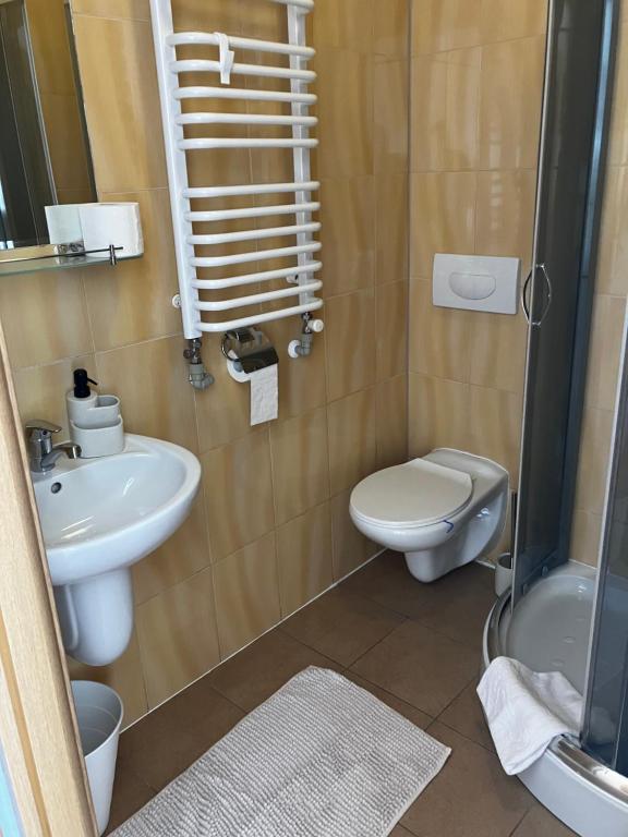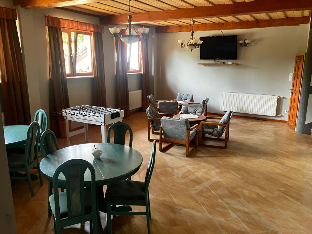 Pokoje: Pokoje w obiekcie posiadają prywatną łazienkę (prysznic, WC, umywalka, lustro) oraz wyposażone są w łóżka, szafę, stolik nocny, stolik, krzesła oraz TV.