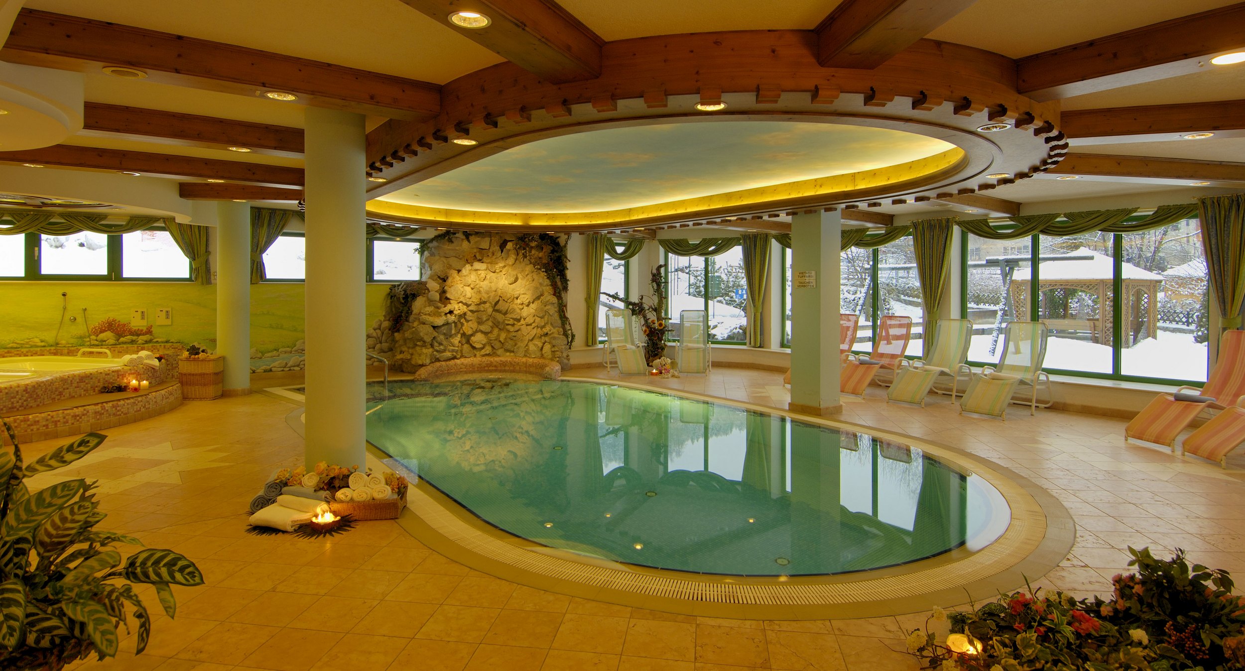 Atrakcje po nartach: Aby uatrakcyjnić gościom pobyt, hotel oddaje do dyspozycji rozbudowaną strefę wellness, gdzie znajduje się basen z hydromasażem, sauna fińska, biosauna, łaźnia turecka oraz grota lodowa. Warto również zajrzeć do tutejszej piwnicy z winami, w której znajduje się ponad 100 gatunków tego trunku.